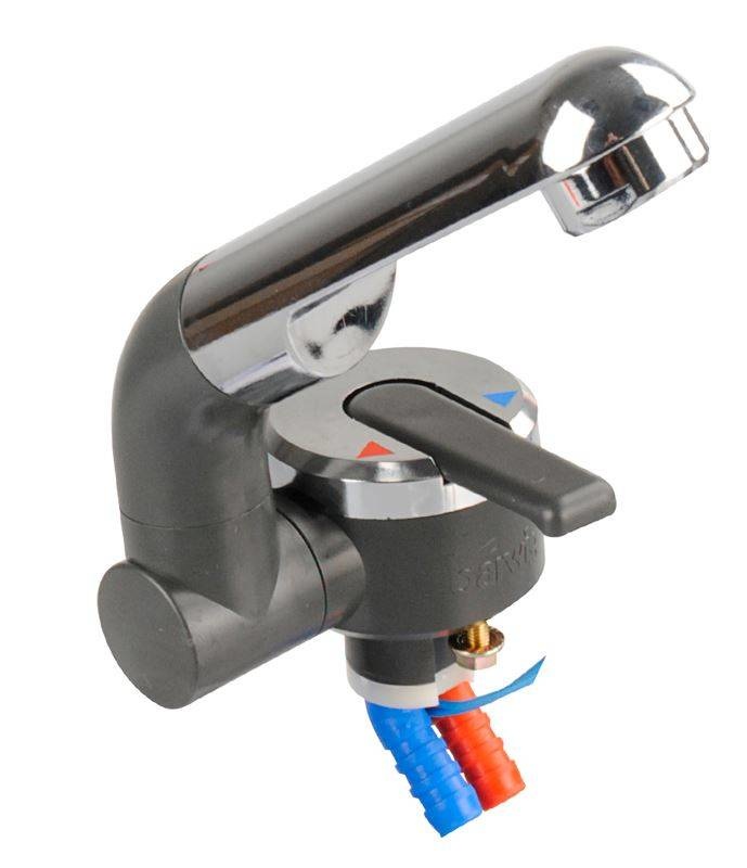 De Barwig Eenhandig mengkranen type Perfect 2000 zijn gemaakt van kunststof en zijn voorzien van keramische afdichting schijven. De waterstraal is instelbaar. Door de lage inbouwhoogte van 40 mm past deze zelfs in een lage wasbak met afdekking. Ook is de wateruitloop draaibaar. Bestand tegen een druk van maximaal 3 bar waardoor deze zowel voor gewone pompen als drukpompen geschikt is. Een veel gebruikte kraan bij TABBERT en HOBBY. Inbouw hoogte: 40 mm. Druk: max. 3 bar. Aansluiting: 2 x tule 8/10 mm. Montagegat: 27 mm.