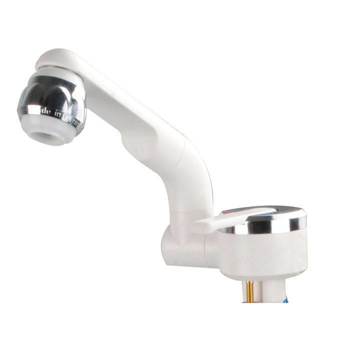 De Barwig Eenhandig mengkranen type Perfect 2000 zijn gemaakt van kunststof en zijn voorzien van keramische afdichting schijven. De waterstraal is instelbaar. Door de lage inbouwhoogte van 40 mm past deze zelfs in een lage wasbak met afdekking. Ook is de wateruitloop draaibaar. Bestand tegen een druk van maximaal 3 bar waardoor deze zowel voor gewone pompen als drukpompen geschikt is. Een veel gebruikte kraan bij TABBERT en HOBBY. Inbouw hoogte: 40 mm. Druk: max. 3 bar. Aansluiting: 2 x tule 8/10 mm. Montagegat: 27 mm.