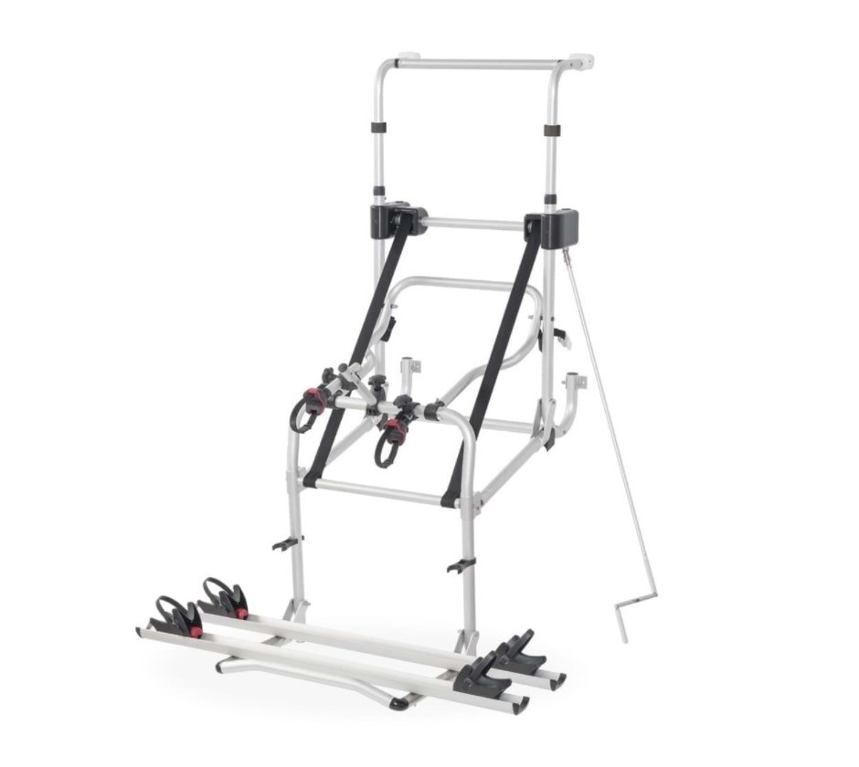 De Carry Bike Lift E-Bike is geheel vernieuwd en geschikt voor de achterwand van de camper. Het draagframe is van roestvrij staal en standaard voorzien van twee Rail Premium wielgoten en Bike Block Pro S 1 en Bike Block Pro S D1 en Security Strip. Ideaal voor het vervoeren van twee elektrische fietsen. Maximaal draagvermogen 60 kg, maximaal 30 kg per wielgoot. Dit fietsenrek kan met behulp van de meegeleverde draaislinger 77 cm zakken wat het op– en afladen van de fietsen een stuk eenvoudiger maakt.