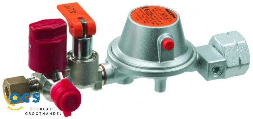 Damptank drukregelaar met kraan en snelkoppeling. Doorlaatcapaciteit 1 kg per uur. 50 mbar uni x 8 mm knel. Drukregelaar EN61 1kg/h 50mbar.