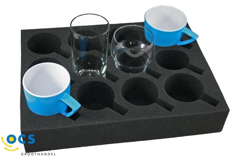 Foam houder voor kopjes en glazen. Er kunnen 12 stuks in. Past in ieder kastje van 330x 245mm. Voorkomt het schuiven van kopjes of glazen tijdens het rijden.