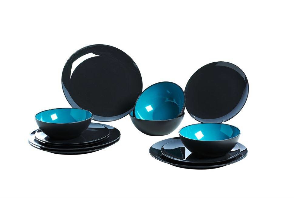 Hoogwaardig melamine-kunststof Greyline Türkis servies 12- delig: * 4 grote borden * 4 kleine borden * 4 muesli schalen. Gewicht: 2,6 kg