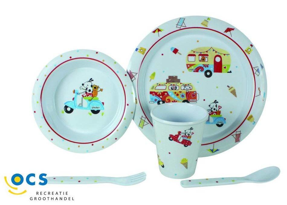 Kinderservies van melamine. Vaatwas bestendig. Bestaat uit: Plat bord, Diep bord en beker en bestek 5 delig, gewicht 350 gr.