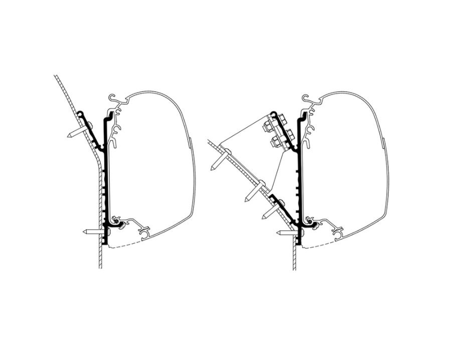 De adapter wordt gemonteerd in combinatie met wandluifel Thule Omnistor 5200 met 3.50 m luifellengte