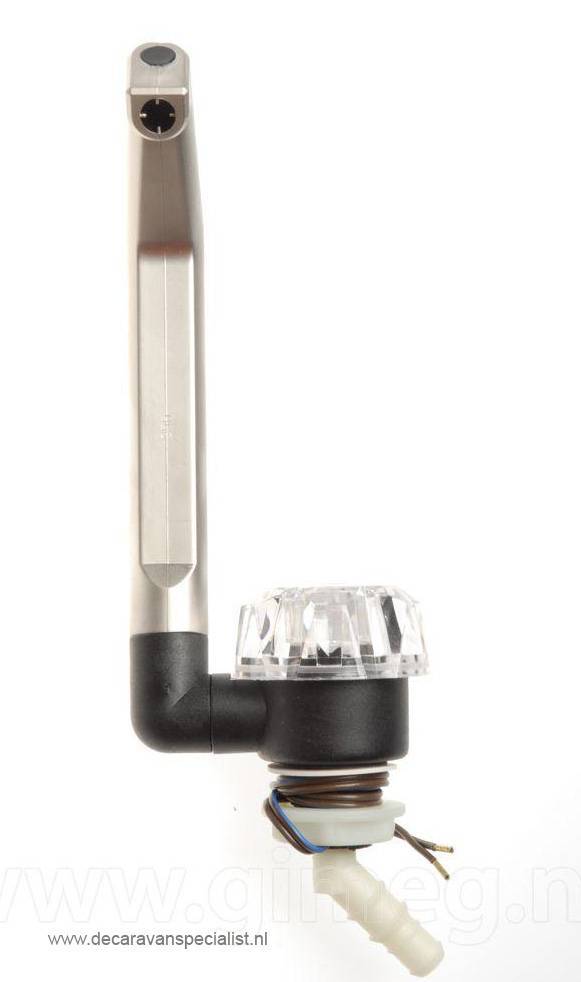 De kraan heeft een ronde knop. Met draai- en zwenkbare uitloop en microschakelaar. Kunststof uitvoering. 12volt. Voorzien van keramisch binnenwerk. Voor slangaansluiting 10mm. Doorvoergat 20mm (koud) 26mm (meng). Inbouw hoogte 38mm. Geschikt tot 3bar.