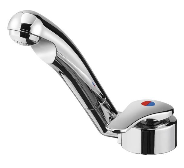 Met verticaal zwenkbare uitloop. Deze kraan heeft een hoge kwaliteit kunststof behuizing in modern design en is vorstbestendig. Door de uitloop te verwijderen kan een 1/2" douche worden aangesloten.