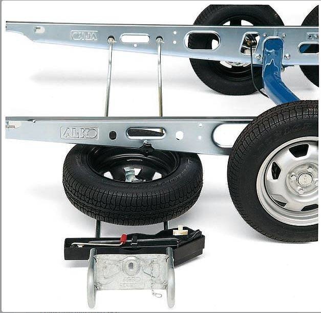 Alle caravans vanaf 1985 met een AL-KO chassis zijn standaard voorzien van montagegaten voor de reservewielhouder. Om de houder te gebruiken eerst de borgketting losmaken en vervolgens stergreep openen en verwijderen. Reservewielhouder met beide handen vastpakken en zover uittrekken dat het reservewiel goed bereikbaar is. Bij een te geringe grondspeling aanhanger eerst met krik omhoog brengen.