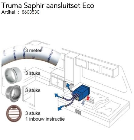 Komplete aansluitset tbv de luchtverdeling voor de Truma Saphir Airconditioners in de “eco” toepassing. Inclusief 3 mtr koude luchtbuis,3 eindstukmoeren EM, 3 eindroosters EN en 3 lamelroosters LA beige.