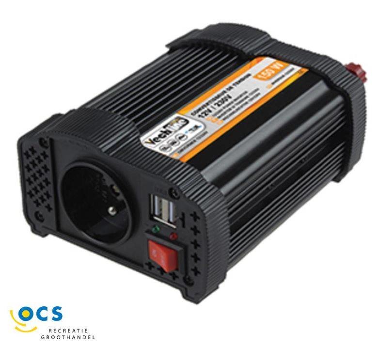 Inverter levert een vermogen 150W. Piek vermogen 300W. Quasi sinus spanning. Voorzien van kabel met sigaretten aansteker. Lengte kabel 100cm. Ompool beveiligd. Voorzien van schakelaar. Beschermd tegen lage voltage-en accuspanning. Standby minder dan 0.3Amp. Afm. lxbxh 16,3x13x5,5cm. Gewicht 0,79Kg.