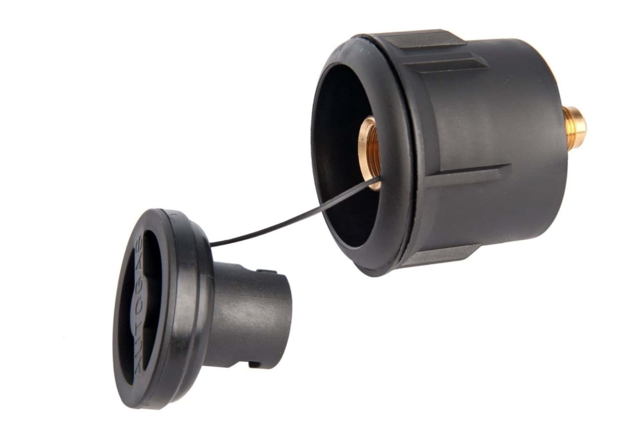 Setje van een verzonken vulpot met afsluitddop voorzien van buitenvuller met bajonet-aansluiting met een rechte aansluiting voor het aansluiten van de vulslang.