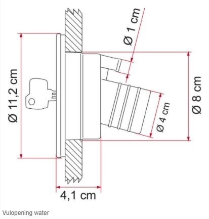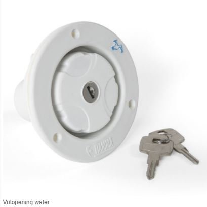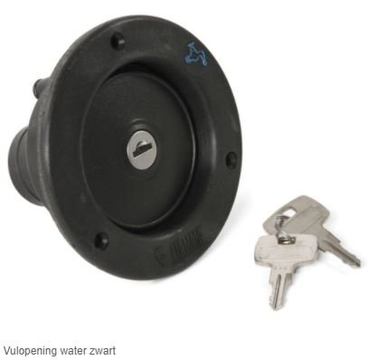Watervulopening afsluitbaar, in de kleur wit of zwart leverbaar. De Watervulopening van Fiamma is een vulopening om je watertank van buiten te kunnen vullen. Deze kan na het vullen worden afgesloten door een afsluitdop met sleutels welke voldoen aan de Europese normen. Aan de binnenkant van de vuldop zit een aansluiting voor ontluchting. Inbouw maat 80 mm, slangaansluiting 40 mm.