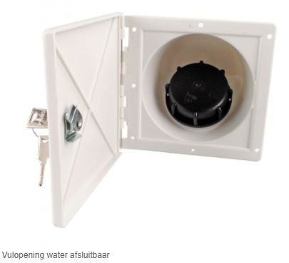 De Watervuldop met slot wordt geleverd met twee sleutels en wordt in de wand ingebouwd. Daarna wordt deze aangesloten op de vaste watertank met een slang van ø 40 mm. Het geheel wordt afgesloten met een deksel waardoor de vuldop niet zichtbaar is en goed beschermd is. Een aansluiting voor ontluchting zit aan de binnenzijde van de vuldop. Uitvoering: Kort model.